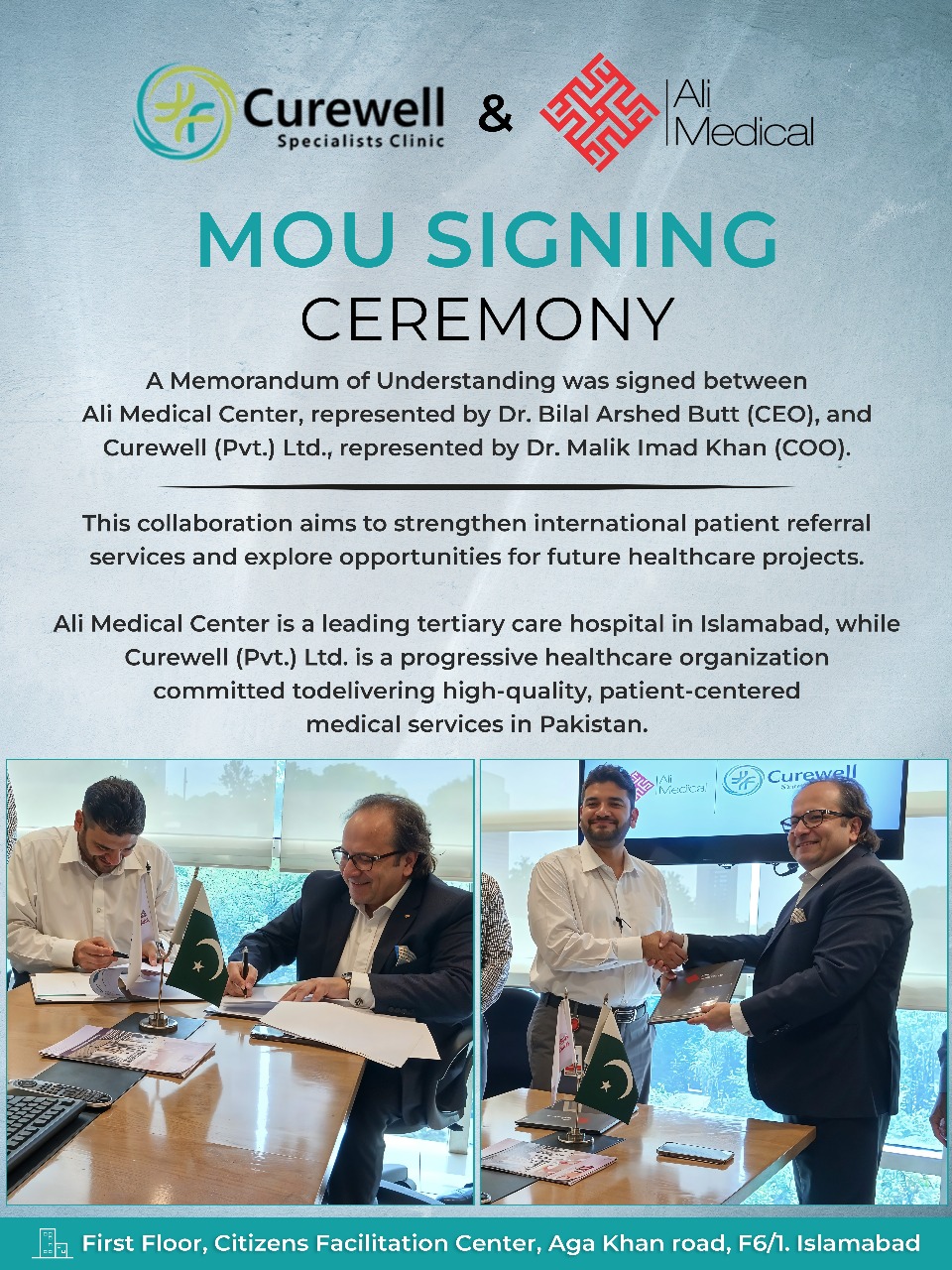 A Memorandum of Understanding was signed between Ali Medical Center, represented by Dr. Bilal Arshad Butt (CEO)